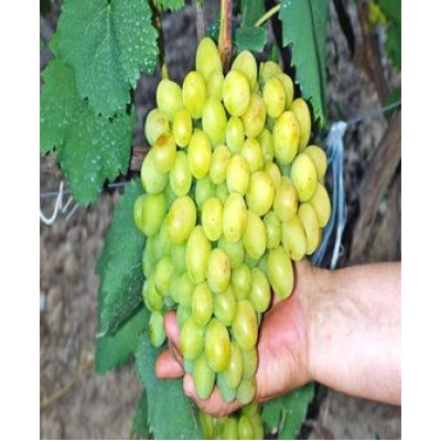 Форма у данного сорта овальная и близка к яйцевидной. Кожура у него плотная, но под ней гармоничная, приятная мякоть с освежающим вкусом. Грозди получаются крупными, в массе от 600 гр до 1,1 кг. Ягоды по размеру примерно равны. Разве что стоит упомянуть такой недостаток, как слабое крепление. К перевозкам устойчивость хорошая, ягоды так же не растрёскиваются.